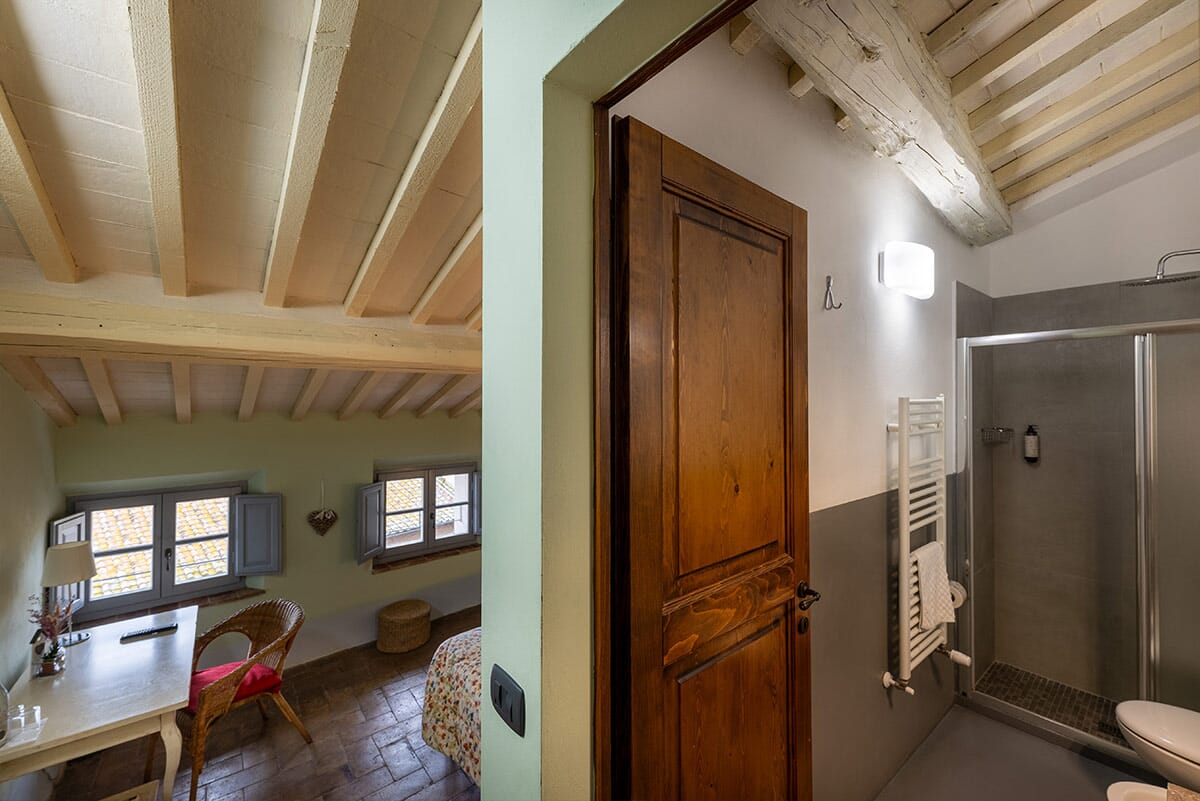 L'Orologio is a double bedroom with private bathroom, bleached exposed beam ceiling and rough terracotta floor. It enjoys a splendid view of the main square and the Val d'Orcia.