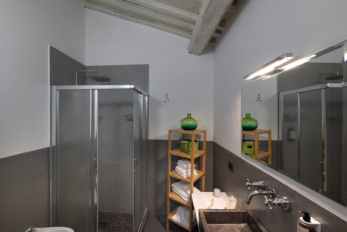 La Piazza is a double bedroom with private bathroom, bleached exposed beam ceiling and rough terracotta floor. Spacious and welcoming, it enjoys a splendid view of the main square with its magnificent loggia and of the Val d'Orcia